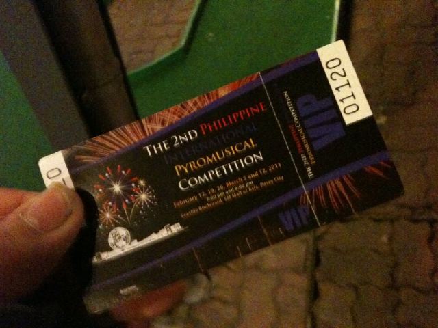 We watched the Pyromusical competition last night at MoA. I was with Poch, Issa and her family that night. It was quite an awesome experience to watch a Fireworks display up-close than at some place far-away. It is also somewhat relieving since I just finished my midterms for accounting during that day. That's a minus one from all the worries that I currently have. It was thanks to this certain couple who gave me this wicked pass to an area where there is no crowded space and was in-fact very spacious.
